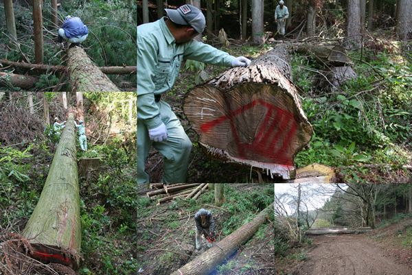 検尺、葉枯らしした後、使用材料の長さに玉切りする。