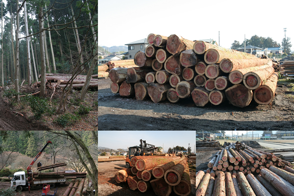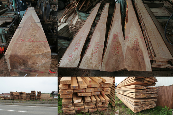 製材所木場での選別。樹種・長さ・太さ・等級毎に分ける。
