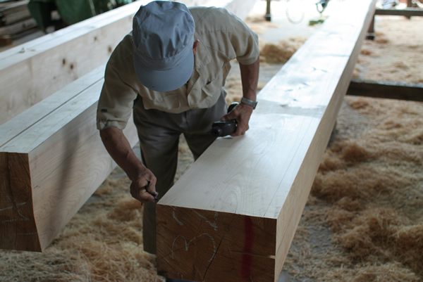 木材加工風景。町田棟梁が棟木の墨付けをする。